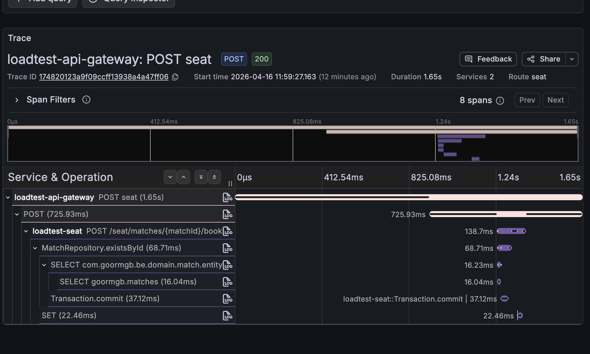 집계 지표만으로는 "seat P99가 4.3s 튄다"까지만 알 수 있고, 어떤 호출 체인의 어떤 구간에서 시간을 먹었는지는 볼 수 없습니다. 이때 Tempo의 분산 트레이스를 조회해 요청 단위로 드릴다운합니다.